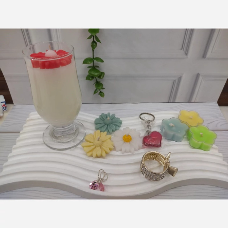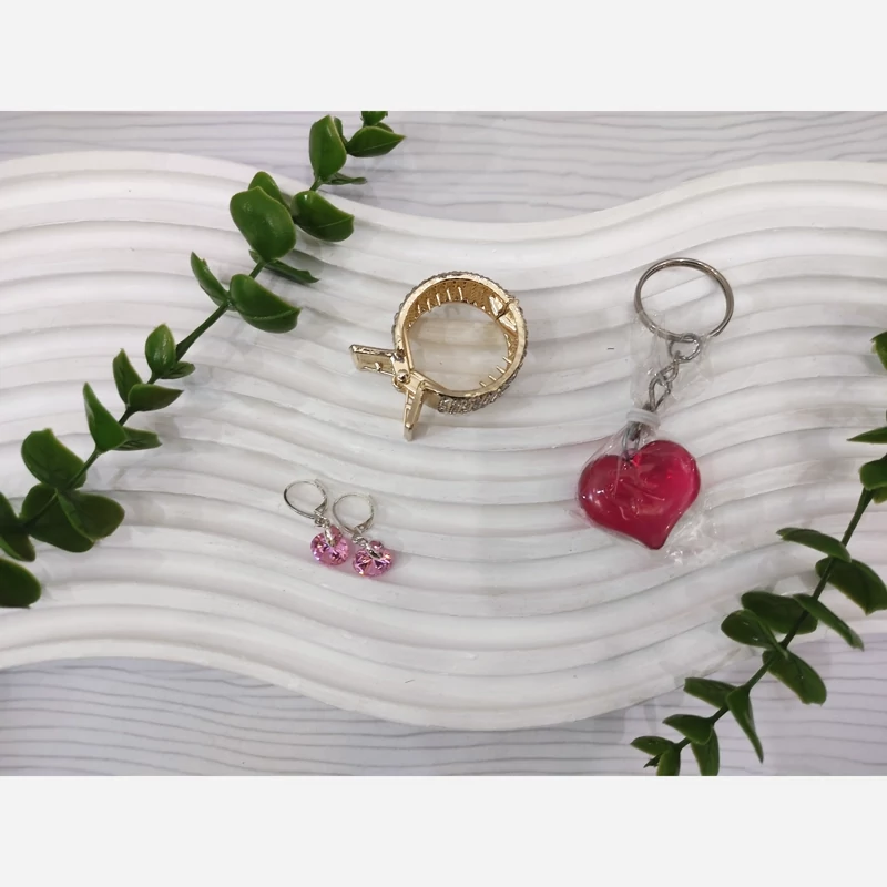 💥 یک عدد مع ظرف شیشهای با گل بابونه قرمز💥 گوشواره صورتی💥 یک عدد کلیپس سامورایی💥 سه عدد گل بابونه💥 سه عدد شمع وارمر مدل گل💥 جاکلیدی قلبی💥 همراه با جعبه کیبوردی و پوشال💥